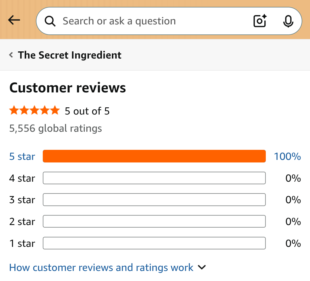 Castle telling his massive audience that he had been negatively review bombed was an indirect encouragement for them to go positively review bomb the book. Whether they had read the book or not, his audience left positive reviews thinking that they would balance out the negativity of hateful one star ratings. They thought they were fighting hatred. The issue is that Castle can and did request to have those negative reviews removed, because they were not valid product reviews. But it’s doubtful his audience knew this was something he could do. In addition, Castle certainly didn’t request that positive review bombs be removed. As of this writing, his books sit strangely high. The Secret Ingredient has over 5000 reviews and a perfect 5.0 star rating. His other book, Pringle and Finn has almost 500 reviews has a 4.9 star rating.