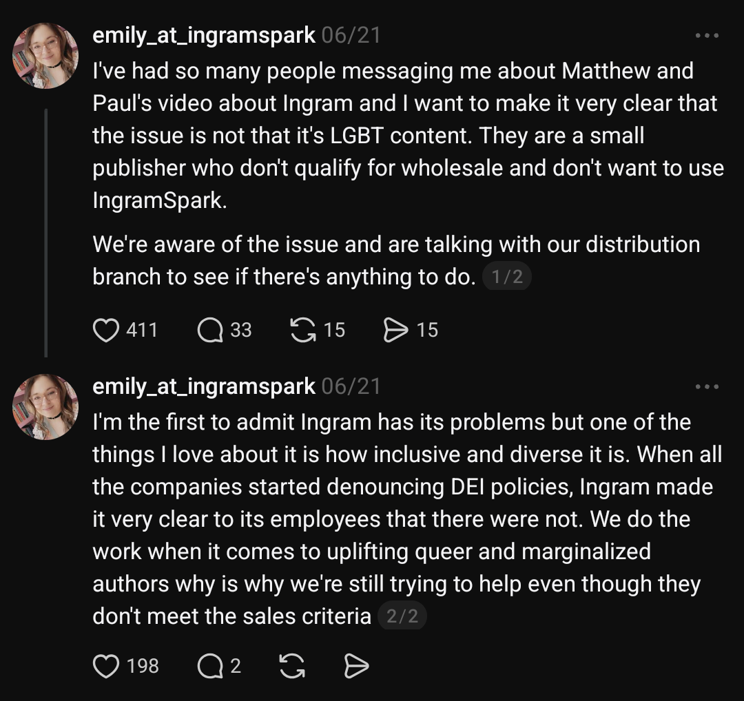 At this point an employee from Ingram began to speak up on social media’s Threads about how Ingram works, in an attempt to help answer questions. Even though Castle had explicitly said he hoped his video would “find the right people at Ingram” who might help him, he quickly told his audience that this employee was spreading lies about him. In my opinion (because I was in the trenches for this drama) she did not lie, she didn’t say anything negative about Castle. She wasn’t even addressing PCS or Castle directly, but sharing information for those asking questions. Here is a screenshot of her typical tone when speaking about it, BUT you don’t have to take my word for it. Go check out her threads for yourself.